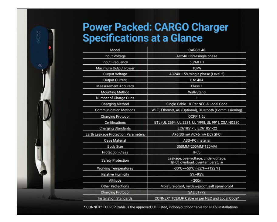 CARGO delivers professional-grade EV charging with 40 amps of power and intelligent battery health monitoring for smarter energy management. Adjust your charge rate for speed or efficiency, connect through Wi-Fi, and control everything in the CARGO App. Safe, UL listed, and weatherproof for indoor or outdoor use—built for reliable, future-ready electric driving.